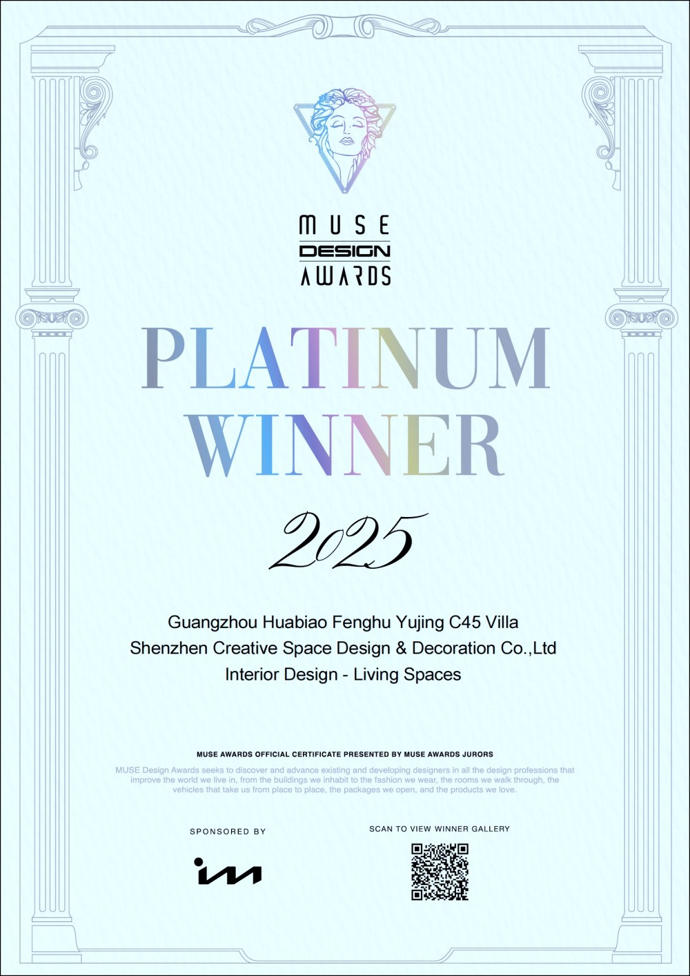 2025年美国MUSE DESIGN AWARDS(缪斯设计奖)获奖名单揭晓!由创域设计创始人殷艳明先生带领的团队设计作品广州·华标峰湖御境C45别墅样板房荣获室内设计-居住空间类铂金奖。