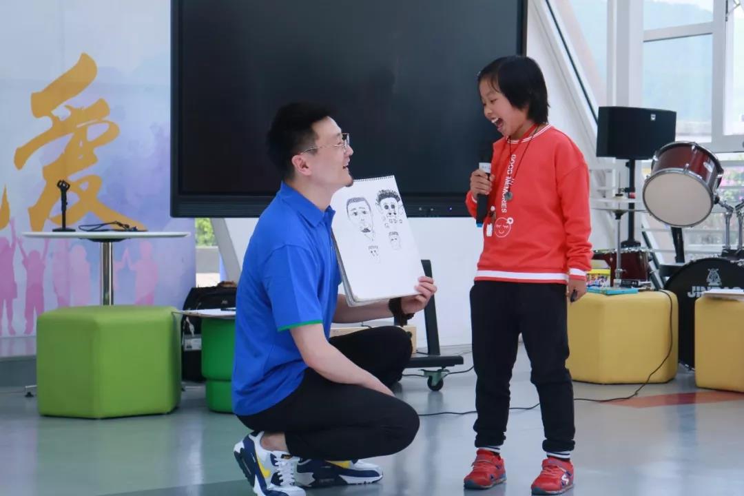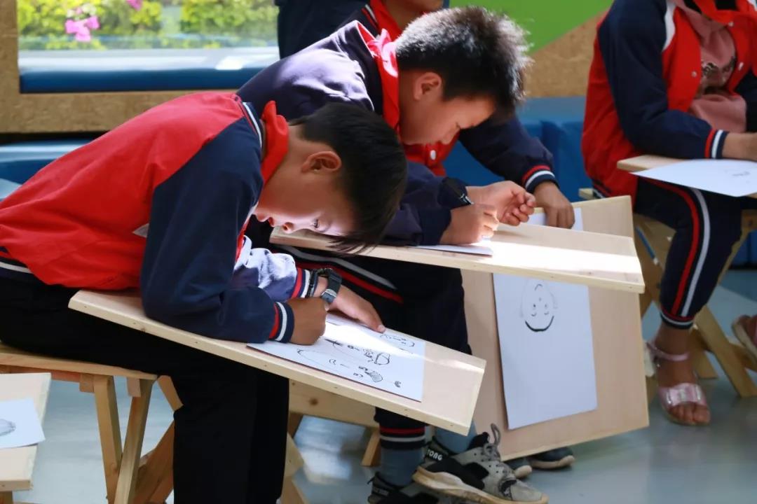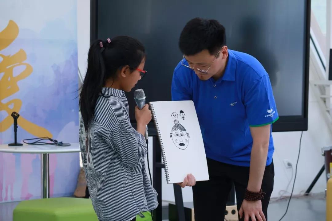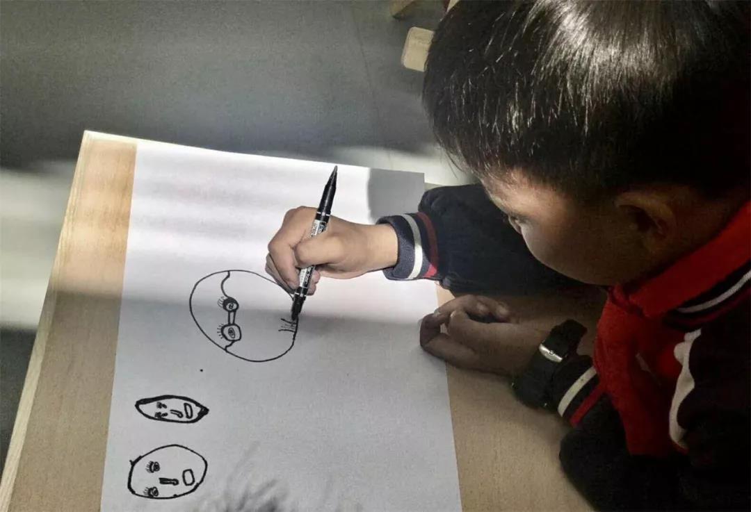 主办方发言结束后,美学课堂也正式拉开了序幕!第一堂课的主题是“脸的创作”,支教老师靳如兴鼓励孩子们画出有特点的表情,并从中感受创作的快乐。