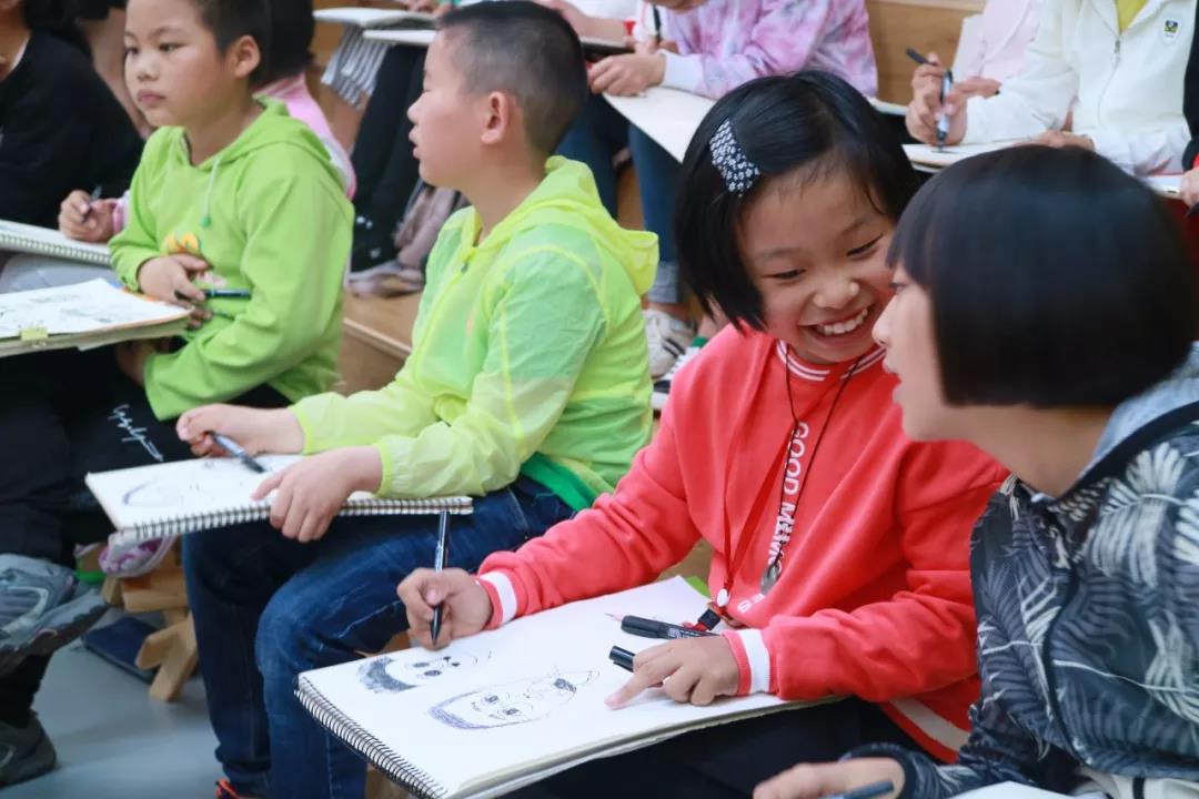靳老师和孩子们分享绘画心得时说道:“创作时,要用自己最真诚的心去感受身边的人、竹子、树和四季,然后用自己的本能随手画下来,就像写日记一样。”经过老师的引导和互动交流,孩子们迅速以饱满的热情投入到脸的创作中.