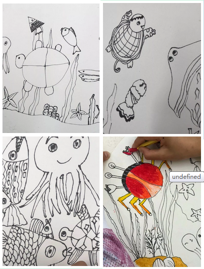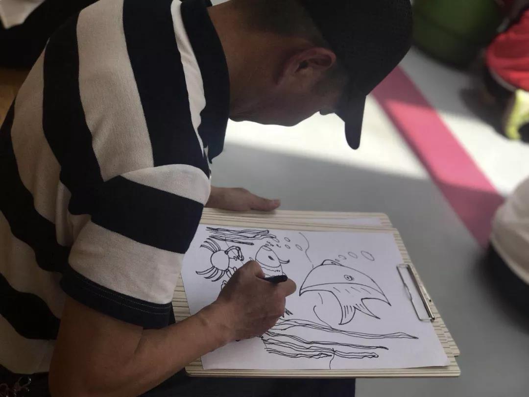 经过支教老师的讲解和其他几位老师的同台倾授以及嘉宾们的辅导创作,一小时后,孩子们的万千海洋世界的美术作品就诞生了!现场还有学生家长也跟着认真描摹起来。